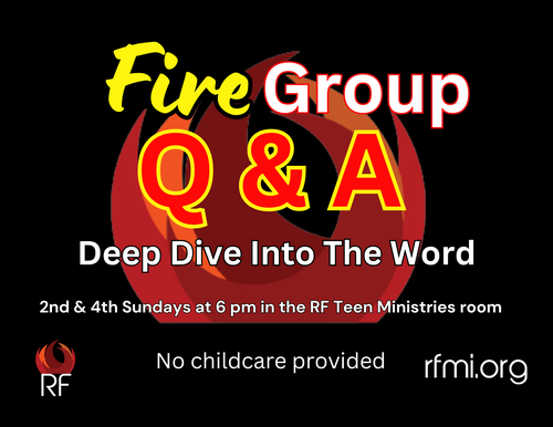 Getting involved with a group of like minded men and women, in a relaxed and casual atmosphere is always fun, you know getting together with friends. RF small groups or our Fire Groups meet on Sunday evenings at 4 pm and 6 pm, see the specifics below. If you have any questions about the Fire groups, please contact us and we will be glad to answer all questions you have.